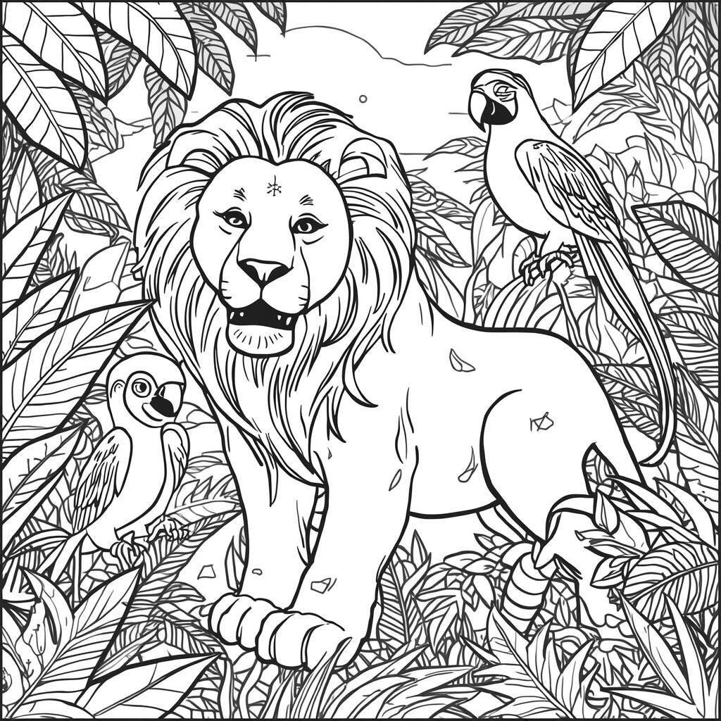 In the vibrant jungle, a majestic lion named Leo decided to organize a huge party for all his friends. He invited his mischievous monkey friend, Mico, who was always up to no good, and the beautiful macaw, Arara, who colored the sky with her bright feathers. Together, they prepared a feast of tropical fruits and fun games. As Leo roared with joy, Mico swung in the trees and Macaw sang happy songs, the jungle was filled with laughter and friendship. It was a perfect day to celebrate the unity between animals and the beauty of nature around them.
