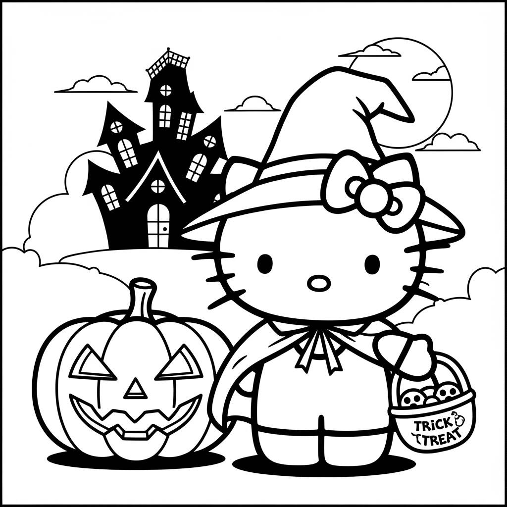 Halloween is approaching and our adorable friend Hello Kitty has decided to dress up for the party! Dressed in a black and orange dress, she's ready for fun, carrying a decorated pumpkin that glows in the moonlight. Their friends, like Pompom Purin and My Melody, also join the party, each with their own fun costumes. As they decorate the house with cobwebs and candy, Hello Kitty gets ready for the big night of trick-or-treating. ‘We’re going to have so much fun!’ she exclaims, full of enthusiasm, ready to live a magical night full of adventures!