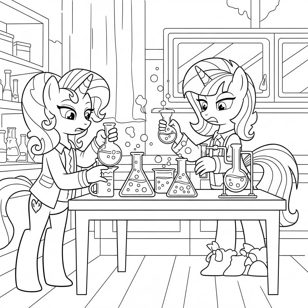 On a sunny day in Ponyville, the Ponies decided to explore the world of science. Twilight Sparkle, always curious, organized an experiment in the library's laboratory. With colorful beakers and bubbling liquids, they mixed magical ingredients to create incredible potions. Pinkie Pie, in her lively way, added a special touch of confetti, while Rarity was concerned with the aesthetics of the mixtures. At the end of the day, they discovered that the real magic was in friendship and collaboration, transforming the laboratory into a place of laughter and discovery. Together, they learned that science can be as fun as a Ponyville party!