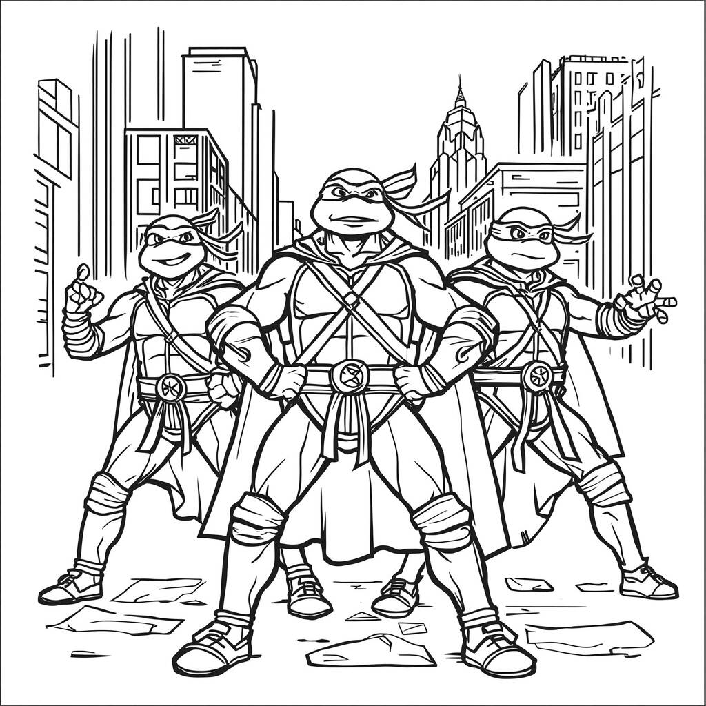 The Teenage Mutant Ninja Turtles, now dressed as superheroes, face a new challenge in New York City. Leonardo, Michelangelo, Donatello and Raphael, with their flowing capes and colorful masks, prepare to protect citizens from a mysterious villain who threatens to spread chaos. While training their combat skills on a rooftop, they hear cries for help coming from a nearby street. Without hesitation, the turtles launch into action, using their ninjutsu techniques and teamwork to save the day. With courage and friendship, they prove that, even as superheroes, true strength lies in unity and determination to fight for what is right.
