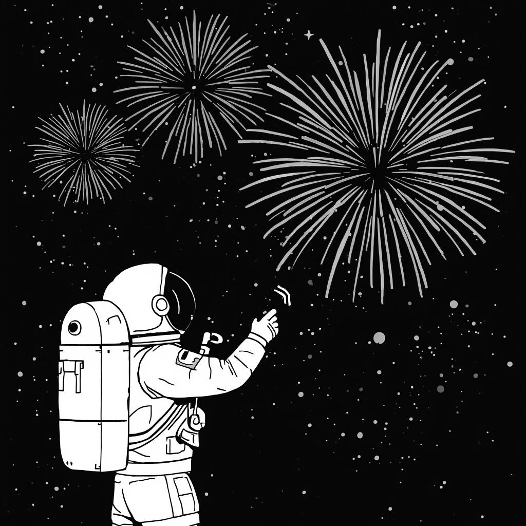 En una misión especial, el astronauta Lucas flota en el espacio y observa la Tierra desde millones de kilómetros de distancia. Mientras se prepara para un experimento científico, ocurre una sorpresa: una lluvia de fuegos artificiales explota a lo lejos, iluminando el vasto cielo negro con colores vibrantes. Encantado, Lucas olvida momentáneamente su tarea, maravillándose de la belleza del espectáculo. Cada estallido de luz es como una celebración de la vida y él siente una conexión profunda con todos los habitantes de la Tierra, incluso a distancia. El universo se convierte en un escenario mágico y él sonríe sabiendo que la alegría no tiene fronteras.