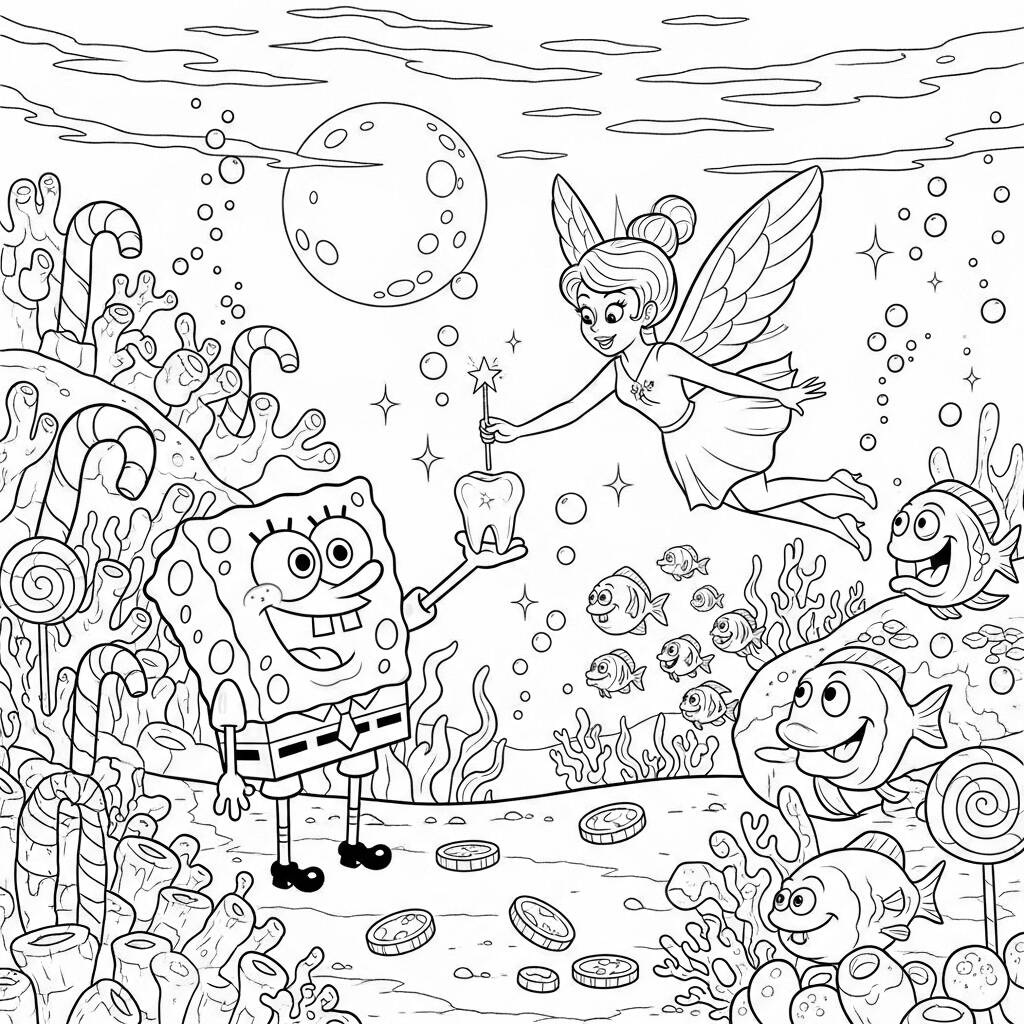 En un día soleado en el fondo del mar, Bob Esponja estaba emocionado de mostrar su nueva colección de dientes de leche que había guardado en un caparazón especial. Mientras admiraba sus tesoros, el Hada de los Dientes apareció con un brillo mágico, flotando entre las algas. "¡Hola, Bob Esponja! ¡Me enteré de tu colección y vine a cambiarlas por unas monedas de concha!", dijo el hada con una sonrisa encantadora. Sorprendido y feliz, Bob Esponja aceptó el intercambio y juntos se embarcaron en una mágica aventura, explorando el fondo del mar en busca de dientes perdidos y contagiando alegría entre los habitantes de Fondo de Bikini.