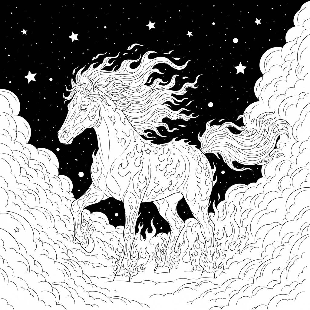 En el reino encantado de Eldoria, un majestuoso caballo hecho de llamas danzantes, conocido como el Caballo de Fuego, galopaba por los cielos estrellados. Su melena de fuego iluminaba la noche, mientras las nubes místicas a su alrededor formaban figuras de criaturas legendarias. Los habitantes del reino creían que él era el guardián de los sueños y las esperanzas, trayendo coraje e inspiración a todos los que lo veían. Una noche mágica, una joven princesa, perdida en sus propios miedos, encontró el Caballo de Fuego. Juntos se embarcaron en una aventura épica, enfrentando desafíos y descubriendo que la verdadera fuerza está en la amistad y la fe en uno mismo.