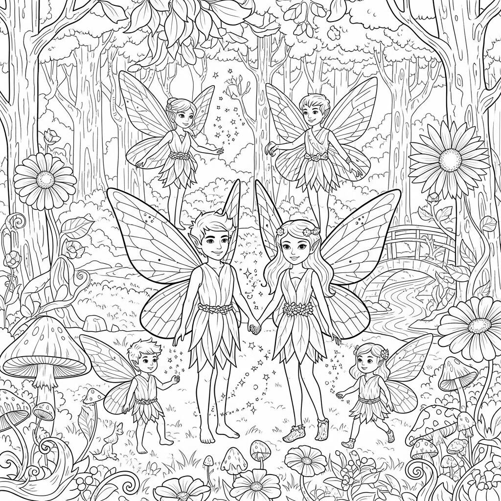 Au cœur d’une forêt enchantée vivait une adorable famille de fées, chacune possédant ses propres ailes lumineuses et colorées. La fée mère, Flora, s'occupait d'un jardin magique plein de fleurs qui dansaient au vent, tandis que la fée père, Fausto, racontait de vieilles histoires à ses chiots, Lúcia et Zico. Chaque matin, ils se rassemblaient pour récolter la rosée magique qui aidait les plantes à fleurir. Lors d'une journée spéciale, les fées décidèrent d'organiser une fête à la lumière de la lune, invitant tous les êtres de la forêt. Avec des rires et de la musique, la fête est devenue une célébration de l'amitié et de la magie qui unissait tout le monde dans ce lieu enchanté.