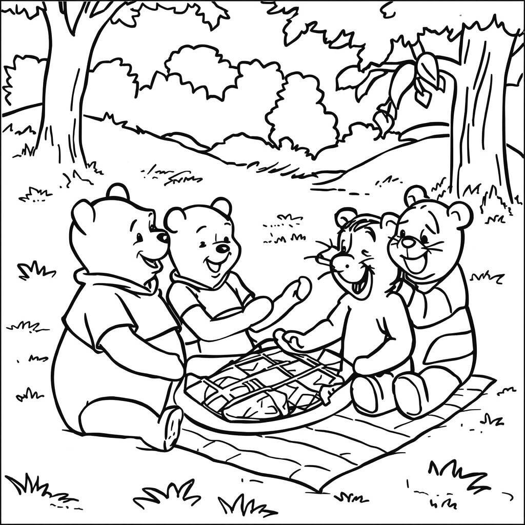 Par une journée ensoleillée, Winnie l'ourson et ses amis, Tigrou, Porcinet et Hibou, ont décidé de pique-niquer dans le bois des Cent Acre. Avec une nappe à carreaux posée sur l'herbe verte, ils ont apporté de délicieuses collations : du miel, des carottes et même un shortcake aux fraises que Pooh adorait. Tout en dégustant les friandises, des rires ont résonné dans tout le parc et des histoires amusantes ont été racontées. Tigrou sautait de joie, Porcinet s'amusait avec ses pitreries et Hibou partageait des curiosités sur la nature. L'amitié entre eux s'est renforcée à chaque instant, montrant que les meilleurs jours sont ceux passés avec ceux que l'on aime.