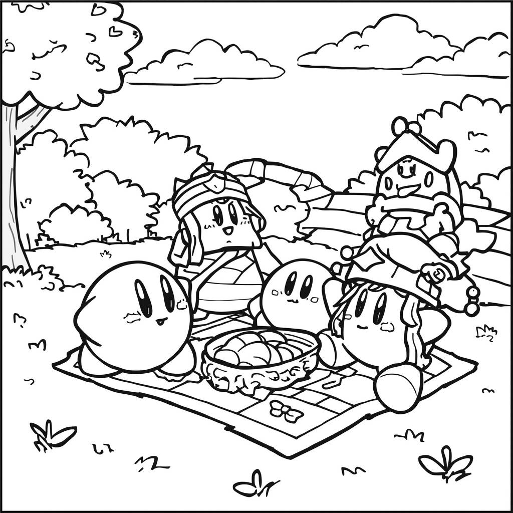 Nello splendido parco di Dream Land, Kirby e i suoi amici, Meta Knight e King Dedede, hanno deciso di fare un picnic sotto il sole splendente. Con una tovaglia a quadretti stesa sull'erba fresca, hanno portato delle prelibatezze: crostate alle fragole, succhi rinfrescanti e perfino qualche fetta di torta. Mentre Kirby si godeva i ravioli, Meta Knight praticava le sue abilità con la spada, tagliando la frutta per l'insalata. Re Dedede, a sua volta, cercò di catturare le formiche che si avvicinavano al cibo, facendo ridere tutti. Il pomeriggio trascorse tra risate e racconti, rafforzando ulteriormente la loro amicizia, mentre il sole cominciava a tramontare all'orizzonte.