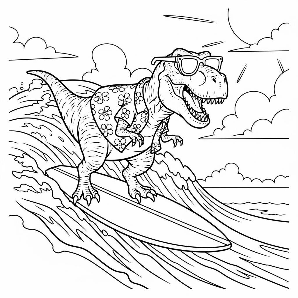 W upalne lato tyranozaur o imieniu Rexy postanowił zamienić prehistoryczne lasy na fale oceanu. Ubrany w kolorową hawajską koszulę i okulary przeciwsłoneczne chwycił deskę surfingową i wyruszył na poszukiwanie idealnej fali. Na plaży ludzie z podziwem patrzyli, jak Rexy sunie po falach, śmiejąc się i bawiąc jak nigdy dotąd. Stał się atrakcją dnia, wykonując akrobacje i pokazując, że nawet dinozaury potrafią surfować. Radość Rexy'ego zarażała wszystkich, udowadniając, że latem warto czerpać z niego jak najwięcej, niezależnie od wielkości i gatunku.