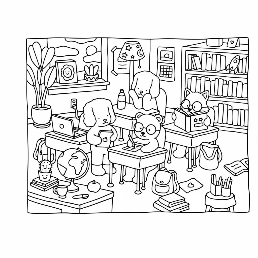 Uma divertida cena de Bobbie Goods na sala de aula, cheia de animais aprendendo e se divertindo.