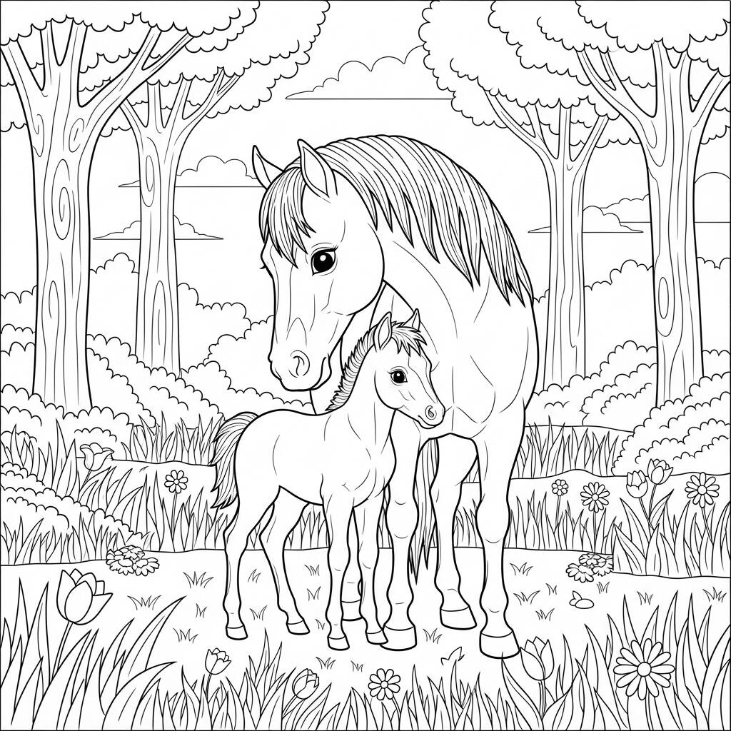 No coração de uma floresta exuberante, uma égua majestosa chamada Estrela pastava tranquilamente ao lado de seu adorável filhote, Pingo. Os raios de sol filtravam-se através das folhas das árvores, criando um cenário mágico repleto de flores coloridas e grama verdejante. Estrela, sempre atenta, observava enquanto Pingo explorava o mundo ao seu redor, saltando alegremente entre as flores e brincando com as borboletas. A natureza ao redor vibrava com sons suaves, e a ligação entre mãe e filho era palpável, simbolizando a beleza da vida selvagem e a importância da família. Juntos, eles desfrutavam de um dia perfeito, repleto de amor e liberdade.
