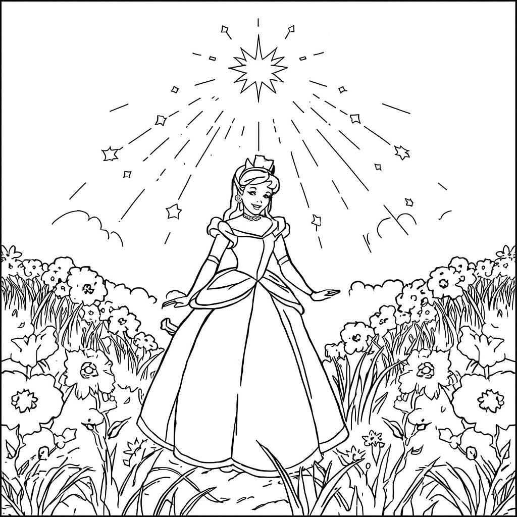 Em uma noite mágica, Cinderela estava em um campo iluminado por uma chuva de estrelas que dançavam no céu. Enquanto as estrelas caíam suavemente ao seu redor, ela lembrou-se do baile encantado onde conhecera o príncipe. Com o coração cheio de esperança, decidiu que não deixaria a tristeza de sua vida anterior a impedir de sonhar novamente. Cada estrela que caía parecia sussurrar promessas de novos começos e aventuras. Cinderela fechou os olhos, desejando que sua vida mudasse para sempre, enquanto as estrelas continuavam a brilhar intensamente, refletindo sua fé em um futuro repleto de amor e felicidade.
