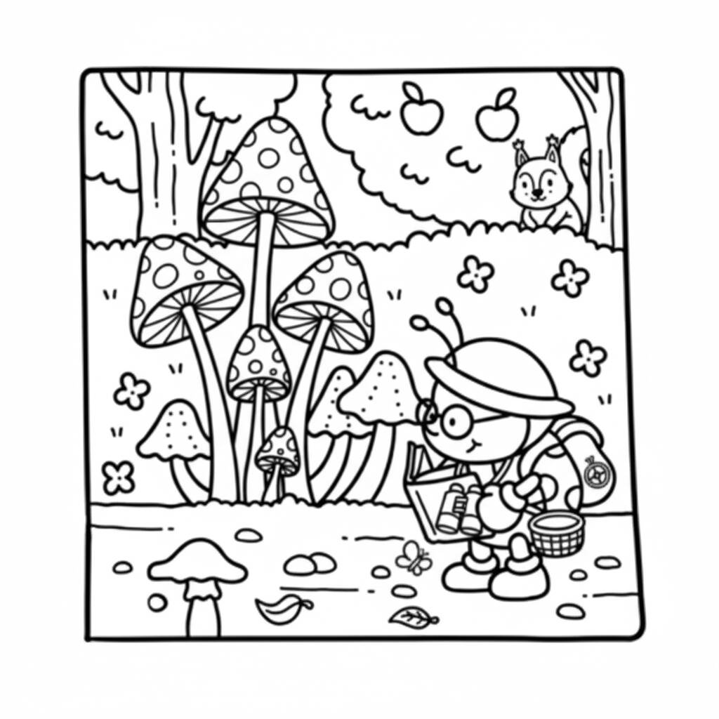 Uma divertida cena de Coco Wyo em uma floresta cheia de cogumelos e natureza.