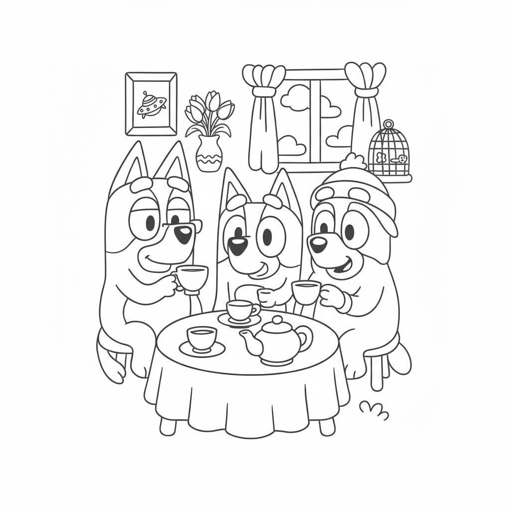 Uma divertida página de colorir com Bluey e seus amigos se divertindo em um chá da tarde.