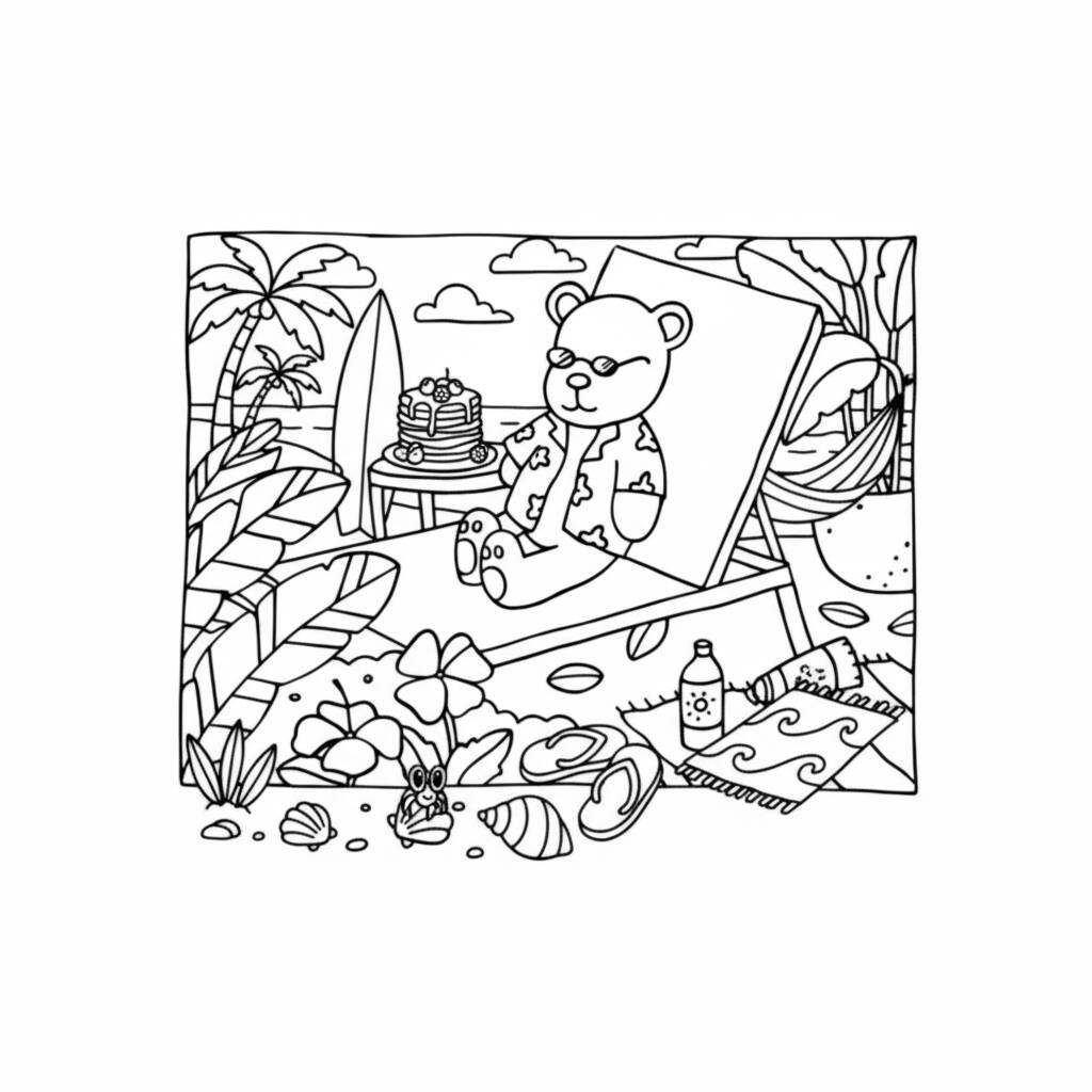 Uma divertida página de colorir dos Bobbie Goods aproveitando um dia ensolarado na praia.