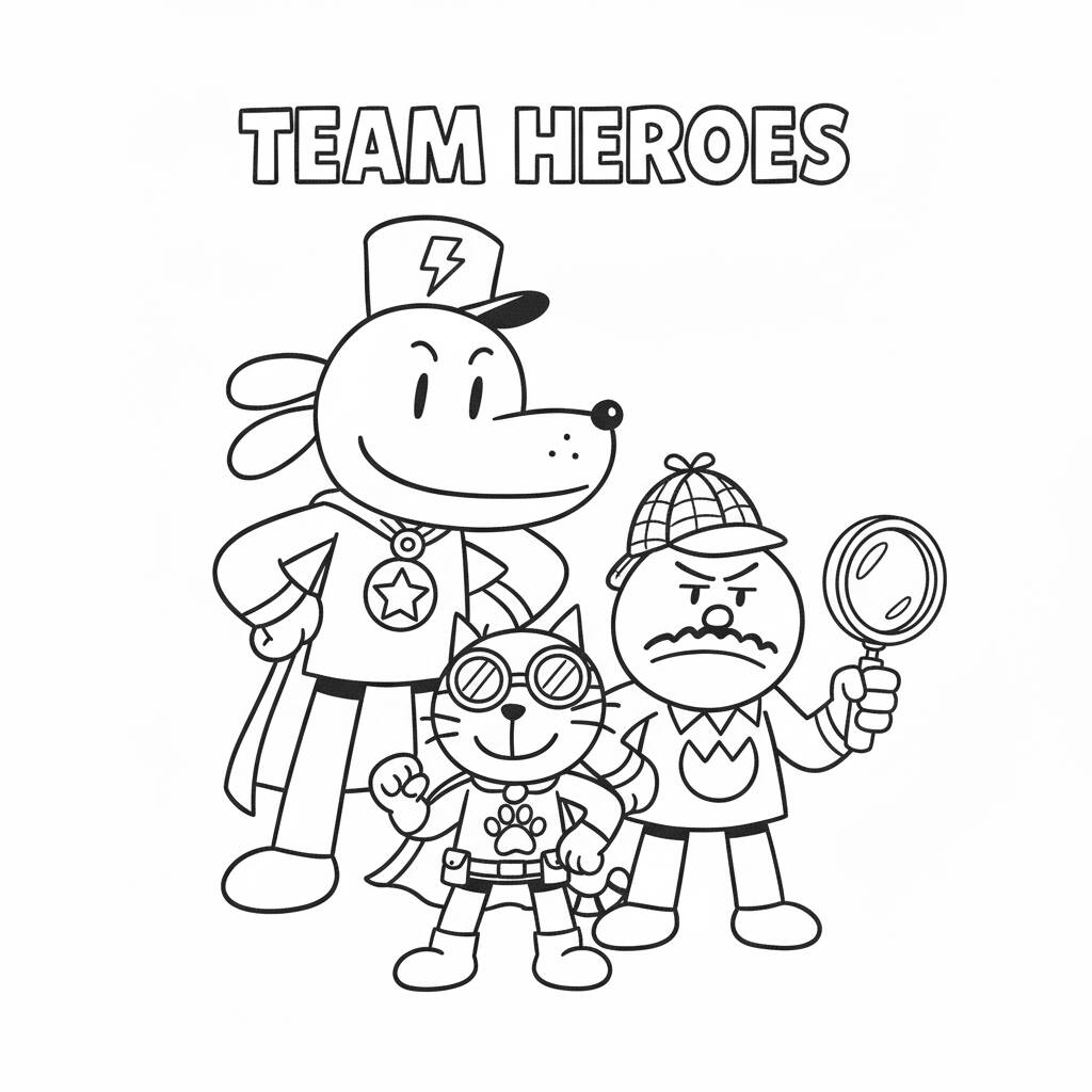 Uma divertida página de colorir com Dog Man e sua equipe de heróis, perfeita para crianças que adoram aventuras.