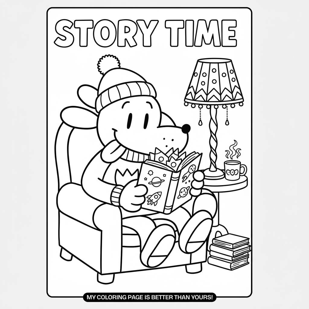 Uma divertida cena do Dog Man relaxando e lendo um livro em um ambiente aconchegante.
