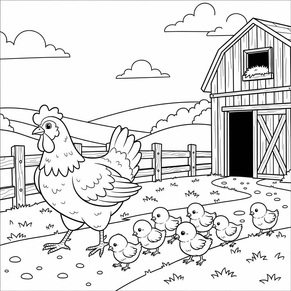 Na Fazenda Mãe Galinha, a manhã começa com um alegre cacarejar. A mãe galinha, com suas penas brilhantes, lidera seus pintinhos pequenos em uma divertida caminhada pelo campo. Eles exploram cada canto do terreno, passando pela velha cerca de madeira e admirando o celeiro vermelho ao fundo. Os pintinhos, cheios de energia, pulam e piam, enquanto a mãe galinha os ensina a procurar por grãos e insetos. A luz do sol brilha suavemente, criando um cenário perfeito para um dia de aventuras na fazenda. Juntos, eles compartilham risadas e descobertas, fortalecendo os laços familiares em meio à beleza da natureza.