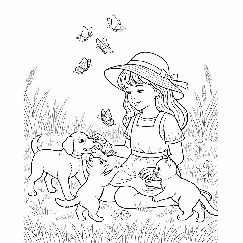 Em um dia ensolarado, uma garota chamada Clara decidiu passar a tarde em um prado florido, onde as borboletas dançavam ao seu redor. Com um chapéu de sol e um vestido leve, ela se sentou na grama verde, observando seu filhote de cachorro, Max, e seu gatinho, Lili, brincando alegremente. Max corria atrás das borboletas, enquanto Lili se escondia entre as flores, pulando de surpresa sempre que Max se aproximava. O riso de Clara ecoava pelo prado, enquanto ela se divertia com a inocência dos animais e a beleza da natureza ao seu redor. Era um momento mágico, onde a amizade e a alegria se uniam em perfeita harmonia.