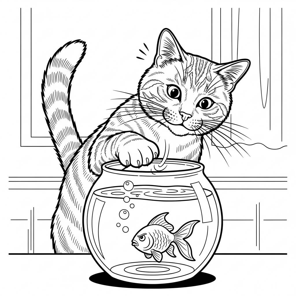 Fofo, o gato curioso, estava sempre em busca de novas aventuras. Um dia, ele avistou um bowl de peixe brilhante na mesa da sala. Com seus olhos arregalados e uma expressão travessa, Fofo se aproximou lentamente, fascinado pelo movimento do peixe que nadava de um lado para o outro. Ele esticou a pata, tentando tocar a água, e o peixe, assustado, mergulhou para o fundo. Fofo não desistiu e começou a brincar com o bowl, fazendo bolhas enquanto tentava entender como aquele ser tão diferente poderia viver dentro de um espaço tão pequeno. As travessuras de Fofo e a dança nervosa do peixe criaram um espetáculo divertido, onde a curiosidade de um gato e a agilidade de um peixe se encontraram em uma divertida brincadeira.