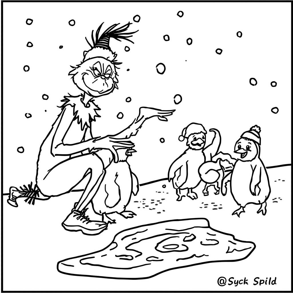 No coração do inverno, o Grinch decidiu deixar de lado sua fama de rabugento e se aventurou em uma nova amizade com um grupo de adoráveis pinguins. Enquanto a neve caía suavemente ao seu redor, ele se divertia deslizando sobre o lago congelado, rindo e brincando com os pinguins que se esforçavam para acompanhá-lo. Juntos, eles criaram um espetáculo de alegria e diversão, construindo bonecos de neve e fazendo guerras de bolas de neve. O Grinch, que antes detestava o Natal, começou a perceber que a verdadeira felicidade estava em compartilhar momentos especiais com novos amigos, mesmo que fossem pinguins em um cenário de inverno mágico.