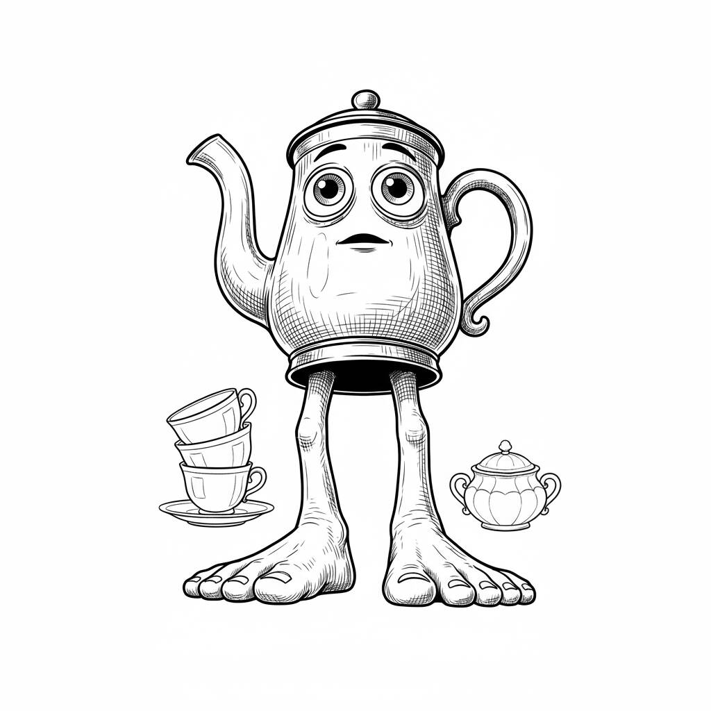 Um divertido bule com pés grandes e expressões engraçadas, perfeito para momentos de criatividade.