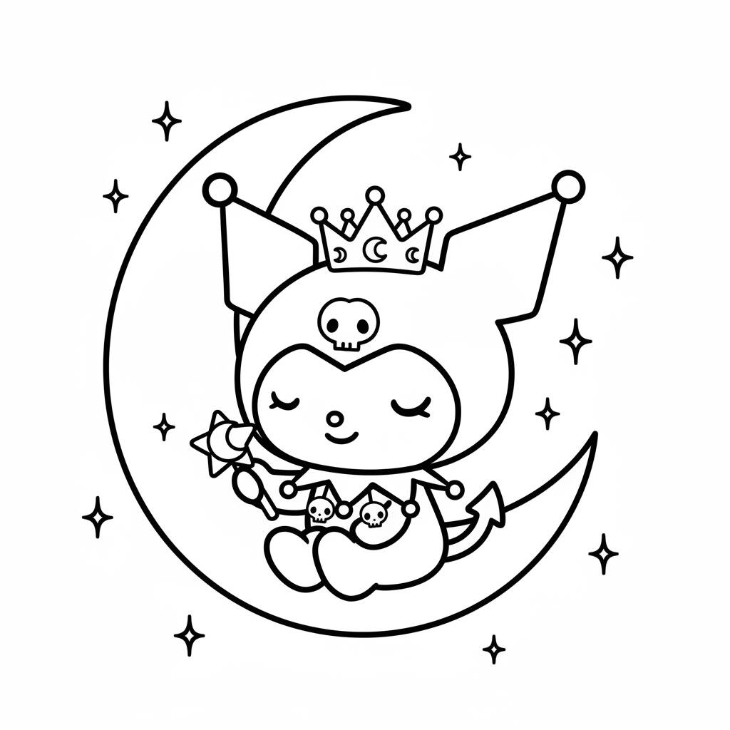 Uma encantadora ilustração da Kuromi sentada na lua, perfeita para os fãs da personagem.