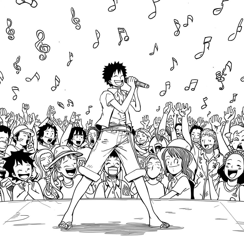 Em uma noite iluminada sob as estrelas, Luffy decidiu que era hora de mostrar seu talento musical. Com um microfone na mão e um sorriso largo no rosto, ele subiu ao palco diante de uma multidão animada que o aplaudia. As notas musicais começaram a flutuar ao seu redor, criando uma atmosfera mágica. Luffy, com sua energia contagiante, cantou sobre suas aventuras nos mares, sobre a amizade e a busca pelo sonho de se tornar o Rei dos Piratas. A multidão cantava junto, unida pela música e pela alegria que Luffy trazia. Foi uma noite inesquecível, onde a música e a amizade se entrelaçaram, deixando todos com o coração cheio de felicidade.