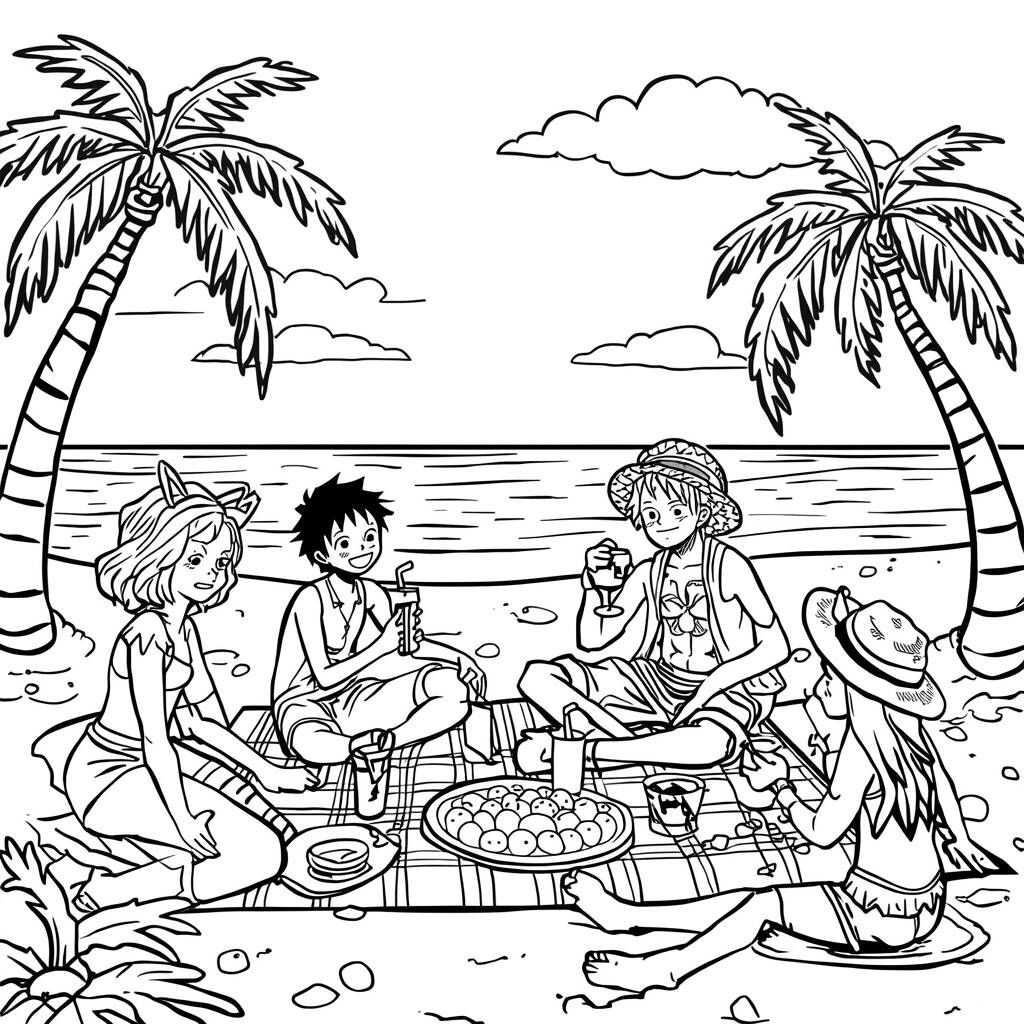 No calor de um lindo dia ensolarado, Luffy e seus amigos decidiram fazer um piquenique na praia. Com toalhas coloridas espalhadas na areia, eles trouxeram uma variedade de frutas frescas e bebidas geladas, prontos para aproveitar a companhia uns dos outros. Enquanto Nami organizava as iguarias, Zoro se acomodava à sombra de uma palmeira, tentando tirar uma soneca. Sanji, sempre preocupado com a comida, preparava pratos deliciosos, enquanto Chopper ajudava a servir as bebidas. Rindo e contando histórias de suas aventuras, a turma celebrava a amizade, sob um céu azul, cercados pelo som das ondas do mar e a brisa suave. Foi um dia perfeito para relaxar e sonhar com novas jornadas juntos.
