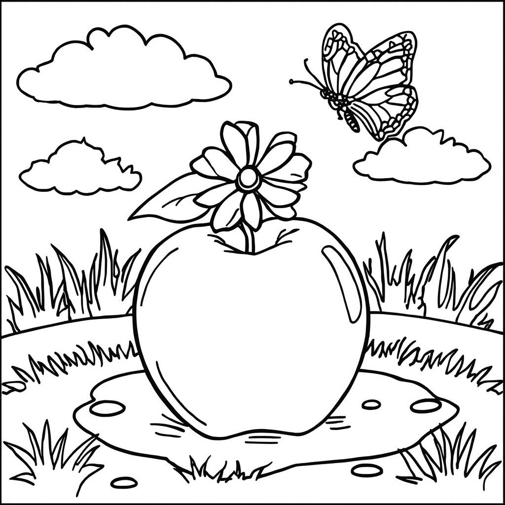 No coração de um jardim encantado, uma maçã vermelha brilhava sob o sol, adornada com uma delicada flor branca que parecia dançar ao vento. Perto dela, uma borboleta colorida flutuava graciosamente, atraída pela beleza da fruta e da flor. Enquanto a borboleta explorava o aroma doce, a maçã sonhava em se tornar parte de uma história mágica, onde seus sabores poderiam alegrar o paladar de alguém especial. O céu azul e as nuvens fofas formavam um cenário perfeito, enquanto a grama verde sussurrava segredos do jardim, prometendo aventuras e descobertas nas próximas estações.