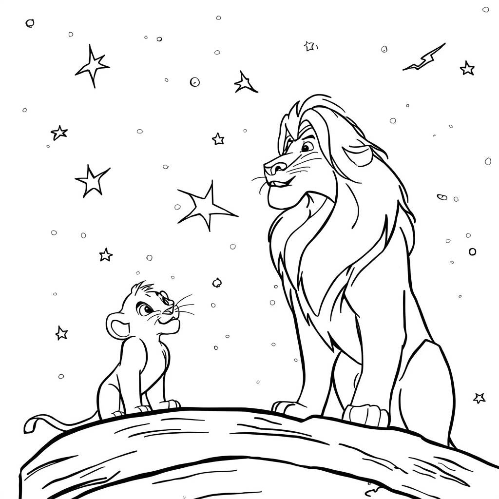 Numa noite estrelada na savana africana, Mufasa, o majestoso rei leão, leva o pequeno Simba para fora da caverna. Com um olhar apaixonado, ele aponta para o céu e começa a ensinar seu filho sobre as constelações. ‘Cada estrela tem uma história, Simba’, diz Mufasa com sabedoria. ‘Elas nos guiam e nos lembram de quem somos’. Simba, com olhos brilhantes, escuta atentamente, sonhando em um dia se tornar um grande rei como seu pai. A conexão entre pai e filho se fortalece sob o manto do céu noturno, onde os sonhos e ensinamentos se entrelaçam como as estrelas. A noite se torna um momento mágico, selando uma memória que Simba levará para sempre em seu coração.