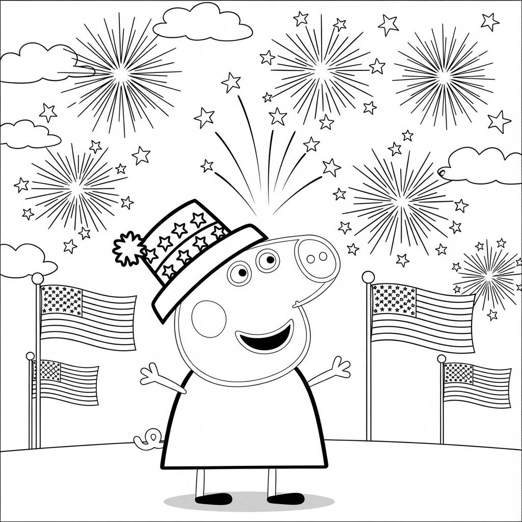 No Dia da Independência, Peppa Pig e sua família se reúnem para celebrar com muita alegria. O céu se ilumina com fogos de artifício coloridos enquanto todos se reúnem no parque para uma grande festa. Papai Pig monta uma barraca cheia de bandeirinhas e balões, enquanto Mamãe Pig prepara deliciosos petiscos para todos. George, animado, veste sua camiseta com as cores da bandeira e corre para brincar com seus amigos. Juntos, eles dançam, cantam e se divertem, celebrando a liberdade e a amizade. No final do dia, todos se reúnem para assistir ao grandioso show de fogos, encerrando uma festa inesquecível.