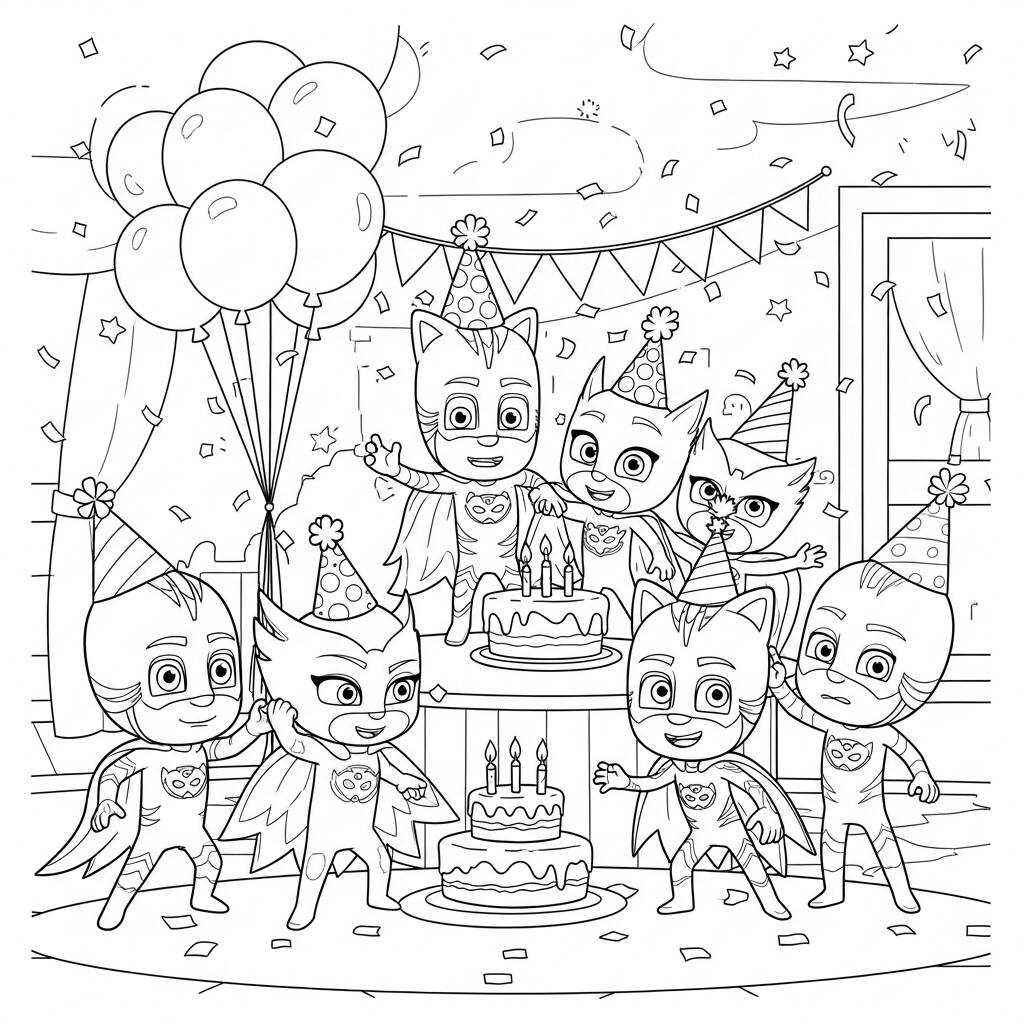 Hoje é um dia especial para os nossos heróis favoritos, os Pj Masks! Eles estão se preparando para uma incrível festa de aniversário, cheia de balões coloridos e um bolo gigante decorado com velas. Catboy, Owlette e Gekko vestem chapéus de festa e estão animados para celebrar juntos. Enquanto a música toca, eles dançam e se divertem, jogando confete por toda parte. A festa promete ser cheia de surpresas, e os amigos estão prontos para se divertir e fazer novos desafios, mesmo que isso signifique enfrentar um vilão que tenta estragar a comemoração. Será que eles conseguirão manter a festa em ordem? Vamos descobrir!