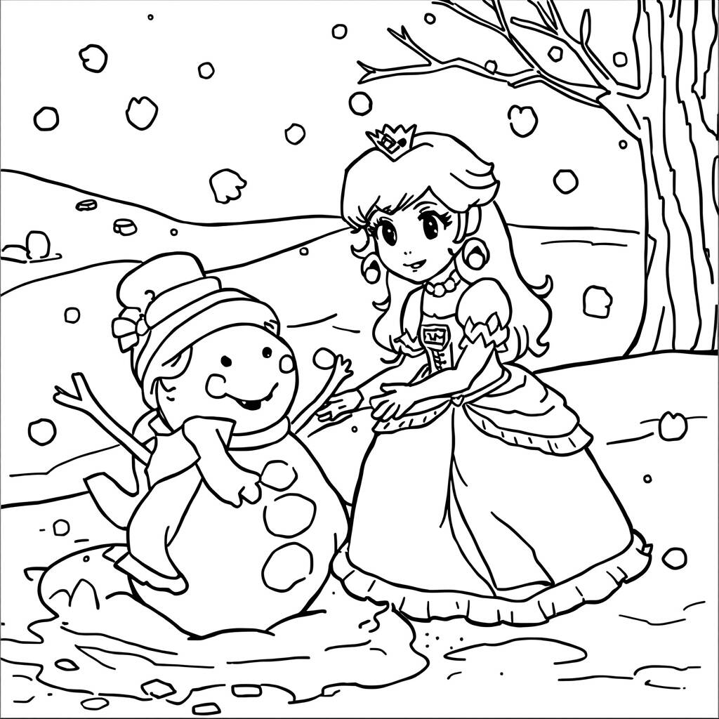 No reino do Cogumelo, a Princesa Peach decidiu aproveitar o inverno e se divertir na neve. Com seu vestido rosa contrastando com o branco da neve, ela saiu para o jardim do castelo, onde a paisagem estava coberta por um manto de flocos brilhantes. Enquanto brincava, Peach começou a construir um enorme boneco de neve, colocando uma cenoura como nariz e usando um cachecol colorido. Rindo e se divertindo, ela fez bolas de neve e desafiou seus amigos Mario e Luigi para uma batalha amistosa. O dia foi repleto de risadas, e a alegria de Peach iluminou o frio do inverno, fazendo com que todos se sentissem aquecidos por dentro.