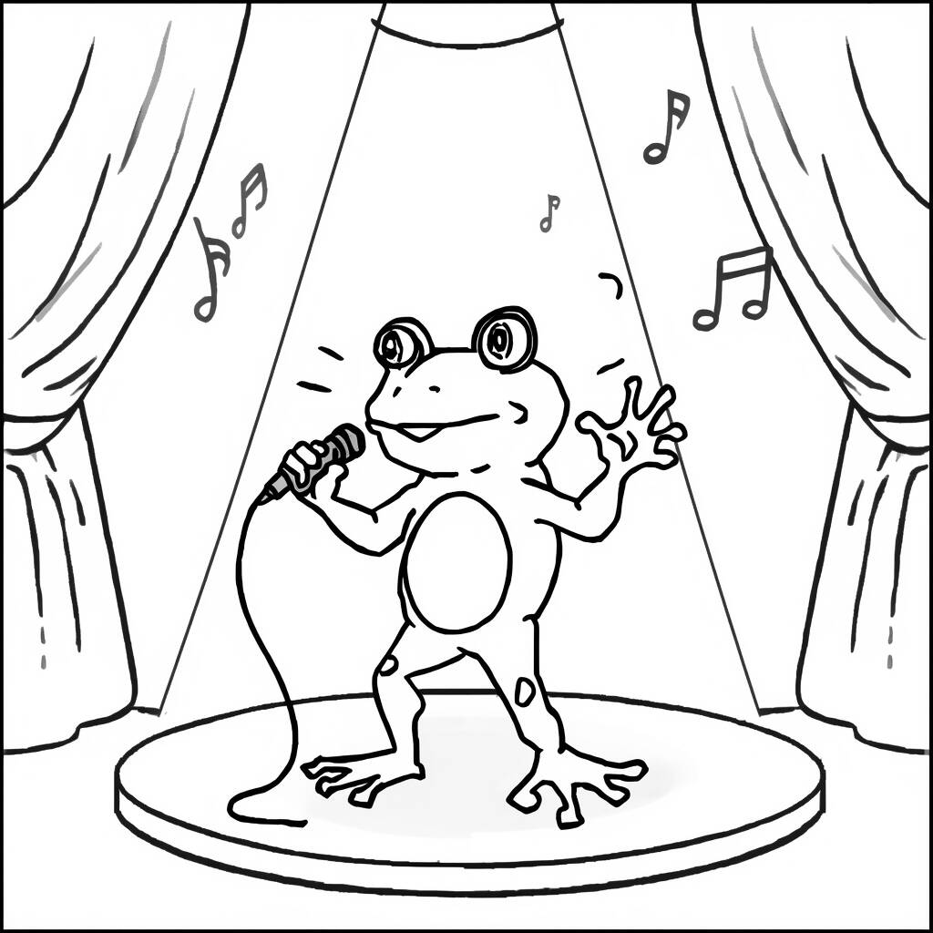 Em uma pequena lagoa, o Sapo Cantor sonhava em ser uma estrela. Todas as noites, ele ensaiava suas canções sob a luz da lua, enquanto os outros animais o ouviam com atenção. Um dia, um famoso produtor musical passou pela lagoa e ficou encantado com a voz do sapo. Decidido a dar uma chance ao Sapo Cantor, ele o convidou para se apresentar em um grande palco. Com o coração acelerado, o sapo subiu ao palco, iluminado por um holofote, e começou a cantar, fazendo com que notas musicais dançassem ao seu redor. A plateia ficou maravilhada, e o Sapo Cantor finalmente realizou seu sonho de brilhar sob os holofotes.