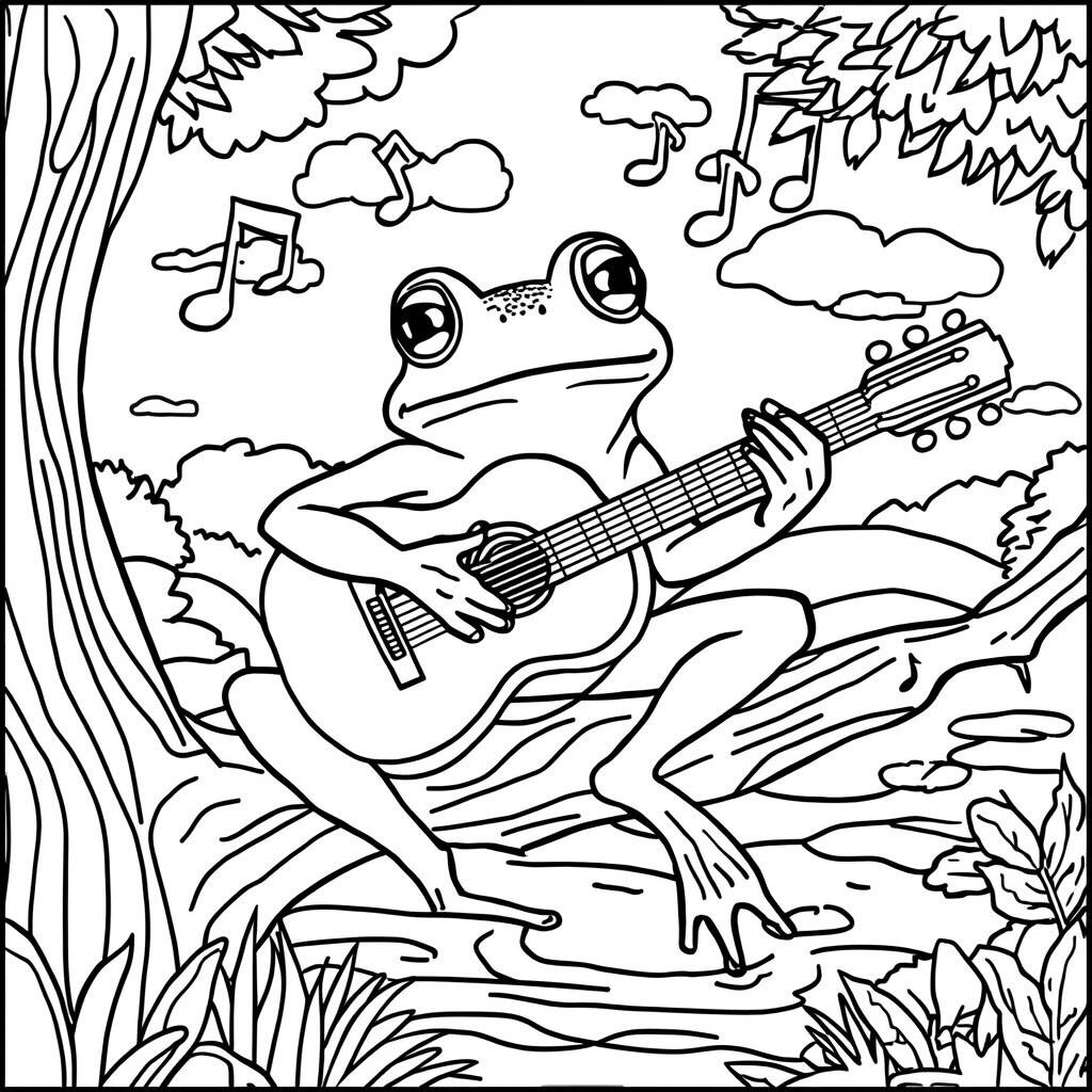 Em uma floresta encantada, Sapo era conhecido por sua habilidade musical. Um dia, ele decidiu pegar sua guitarra e se sentar em uma ramificação de árvore, com uma vista deslumbrante ao fundo. Enquanto tocava, notas musicais dançavam pelo ar, atraindo a atenção de outros animais da floresta. Pássaros, coelhos e até mesmo uma família de esquilos se juntaram a ele, formando uma alegre plateia. Sapo, encantado com a companhia, começou a compor uma canção sobre a amizade e a beleza da natureza. A música ecoou por toda a floresta, unindo os animais em uma celebração de harmonia e alegria.