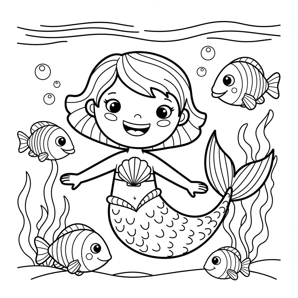 Em um reino mágico sob o mar, vivia uma sereia chamada Lila, que adorava brincar com seus amigos peixes coloridos e dançar entre as algas. Com seu sorriso radiante e cabelo curto, Lila sempre estava disposta a ajudar os outros, trazendo alegria para todos ao seu redor. Um dia, ela encontrou uma concha especial que brilhava como estrelas, e decidiu que era hora de organizar uma grande festa no fundo do oceano. Lila convidou todos os seus amigos, e juntos, eles nadaram e se divertiram, criando memórias inesquecíveis. A festa se tornou um evento anual, celebrando a amizade e a magia do mar!