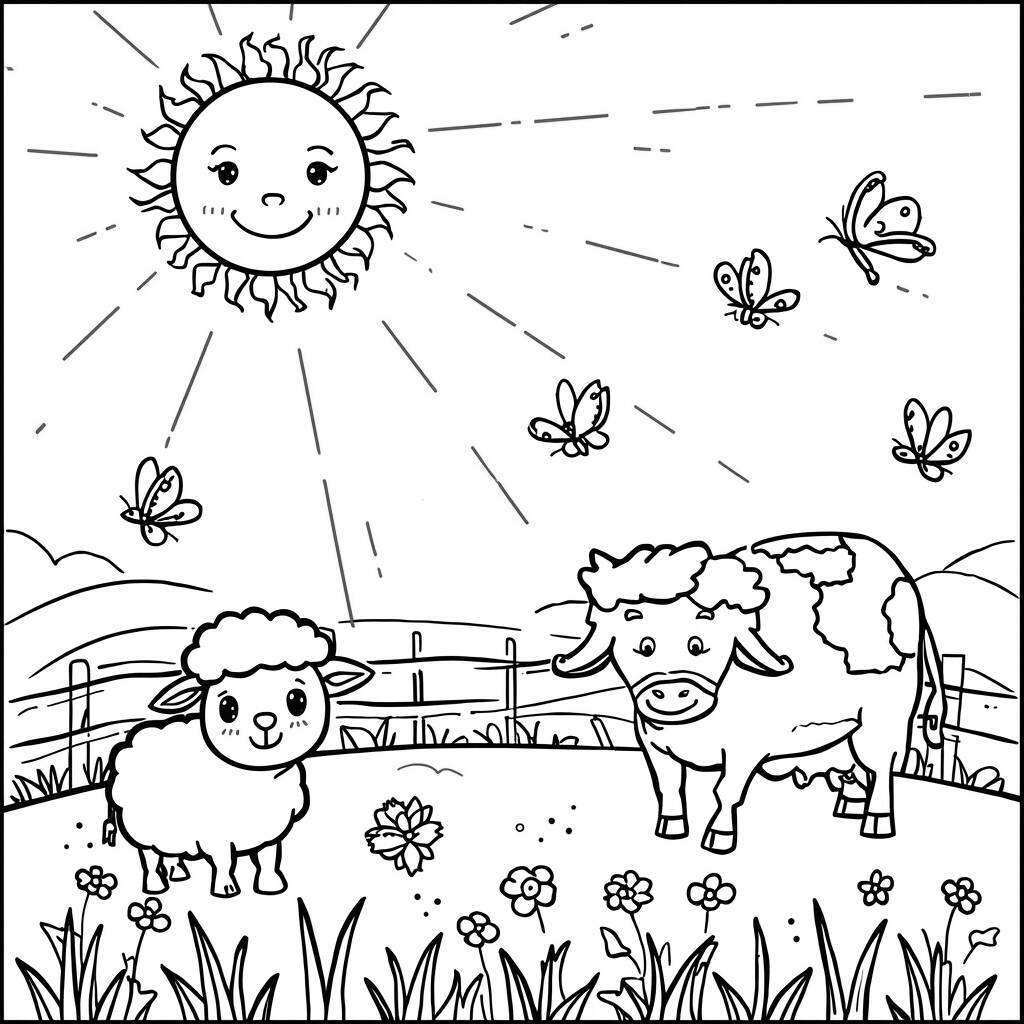 Era um dia ensolarado no campo, e o Sol sorria alegremente enquanto iluminava a paisagem verdejante. As ovelhas pastavam tranquilamente, enquanto a vaca, com seu olhar gentil, observava as borboletas dançantes que flutuavam ao seu redor. Os sons suaves dos animais e o calor do Sol criavam uma atmosfera mágica, onde a felicidade reinava. As flores coloridas se abriam para receber os raios dourados, e todos no campo sentiam a alegria que aquele dia trazia. Era um momento perfeito para brincar e explorar, onde cada canto do campo guardava uma nova aventura à espera de ser descoberta.