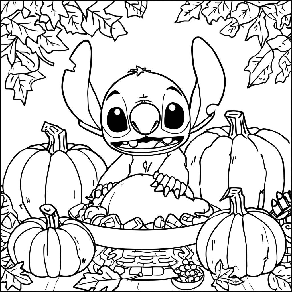 O Dia de Ação de Graças chegou e Stitch está animado para celebrar com sua amiga Lilo. Eles prepararam uma grande festa com uma mesa repleta de delícias, como tortas de abóbora, purê de batatas e, claro, o famoso peru. Enquanto o sol brilha e as folhas de outono caem ao redor, Stitch se veste com um avental colorido e ajuda a Lilo a decorar a mesa com abóboras e flores secas. ‘Vamos agradecer por tudo que temos!’, diz Stitch, sorrindo. A festa promete ser cheia de risadas, boa comida e, acima de tudo, muita amizade.