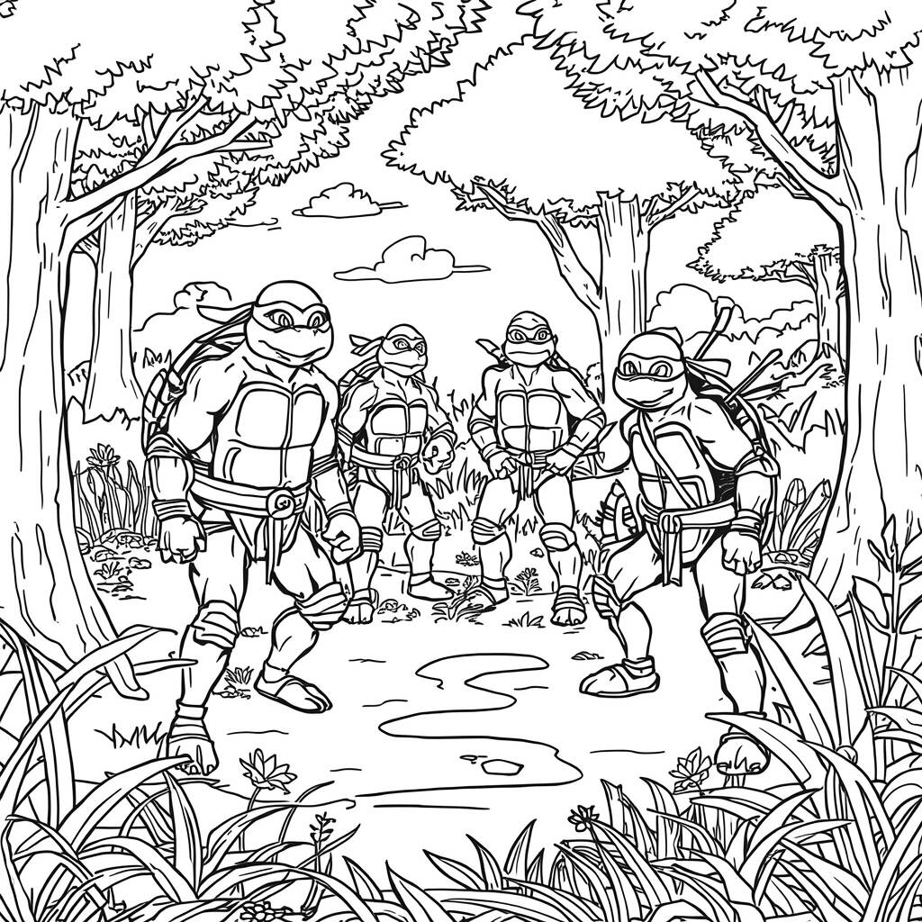 As Tartarugas Ninja decidiram fazer uma pausa em suas aventuras urbanas e se aventurar em uma floresta tranquila, onde a natureza florescia em toda sua beleza. Leonardo, Michelangelo, Donatello e Raphael estavam cercados por árvores majestosas, flores coloridas e animais curiosos que os observavam com atenção. Enquanto exploravam, cada um encontrou um momento especial: Leonardo praticava meditação sob a sombra de uma árvore, Michelangelo fazia amigos com coelhos brincalhões, Donatello coletava amostras de plantas para estudar e Raphael apenas apreciava a calma do ambiente. Juntos, eles redescobriam a importância da natureza e a alegria de estar em harmonia com o mundo ao seu redor.